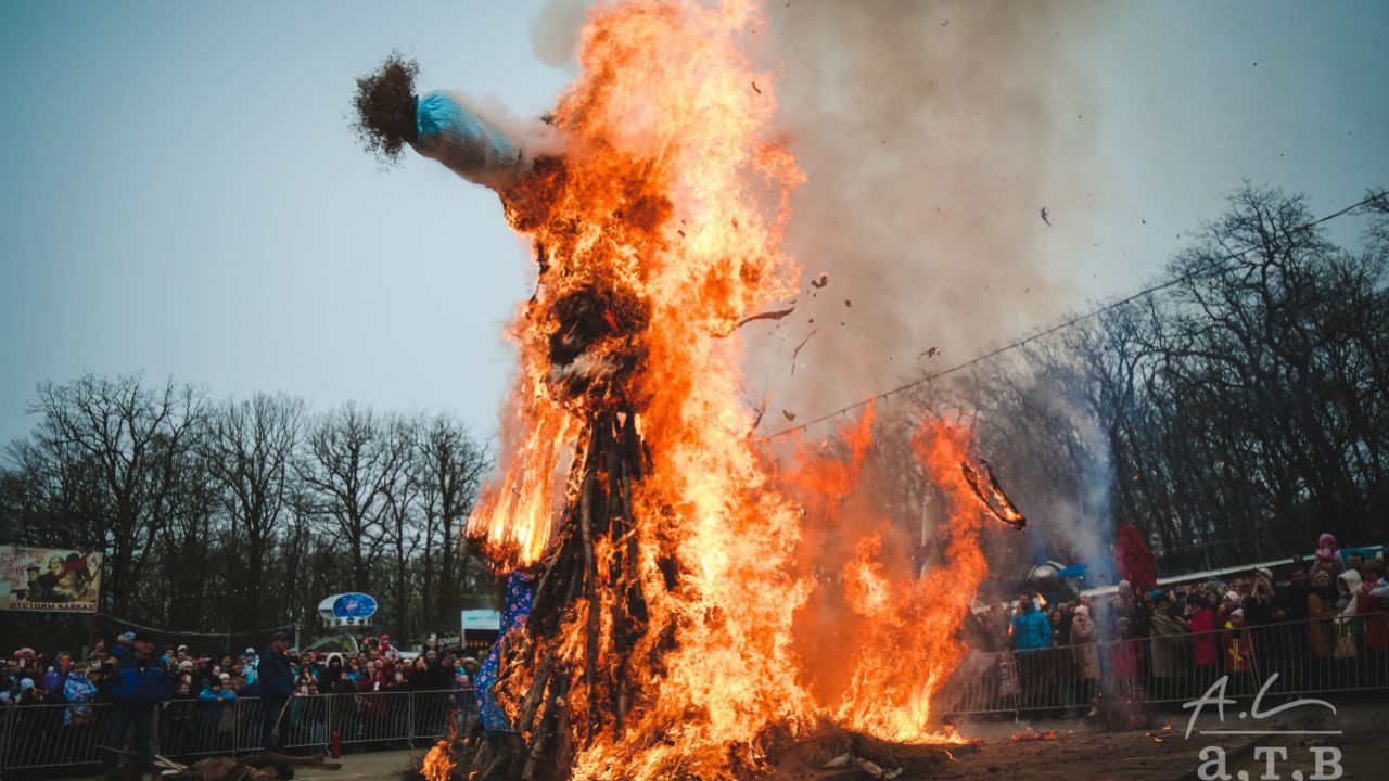 Чучело Масленицы готовили еще в первый день. Всю неделю его возили в санях, катали с горок и пели ему песни. А в Прощеное воскресенье чучело хоронили, разрывали на части или сжигали. Иногда вместо чучела устраивали просто большой костер, через него прыгали и палили в огне старые вещи.
