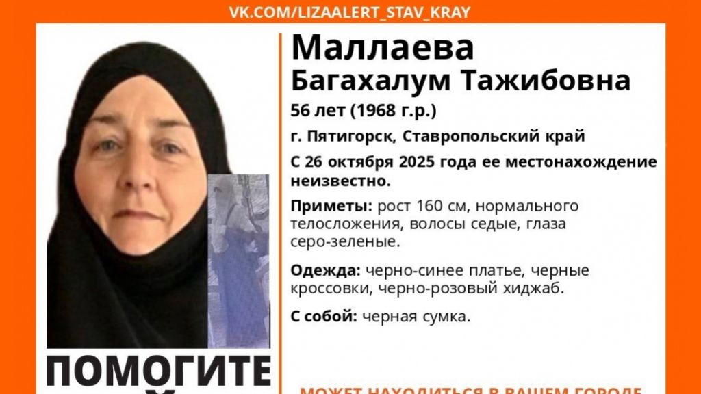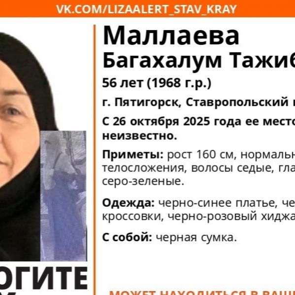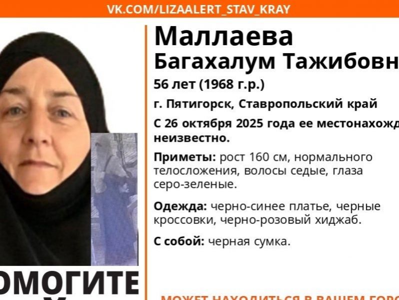 Волонтеры «ЛизаАлерт» ищут 56-летнюю Багахалум Маллаеву из Пятигорска. Где находится женщина – неизвестно с 26 октября. Об этом сообщили в группе поисково-спасательного отряда в ВК.
