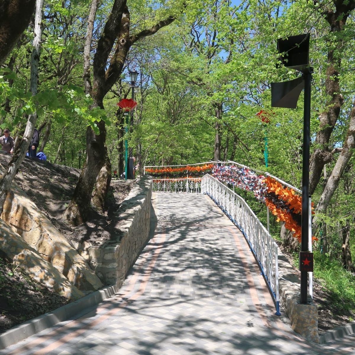 Аллейные фонари украсили красными звездами, края терренккура выложили в цветовой гамме Георгиевской ленты, а входы на украсили каменной композицией санитарной сумки, каски, букета цветов и курортной кружки-бюветницы.