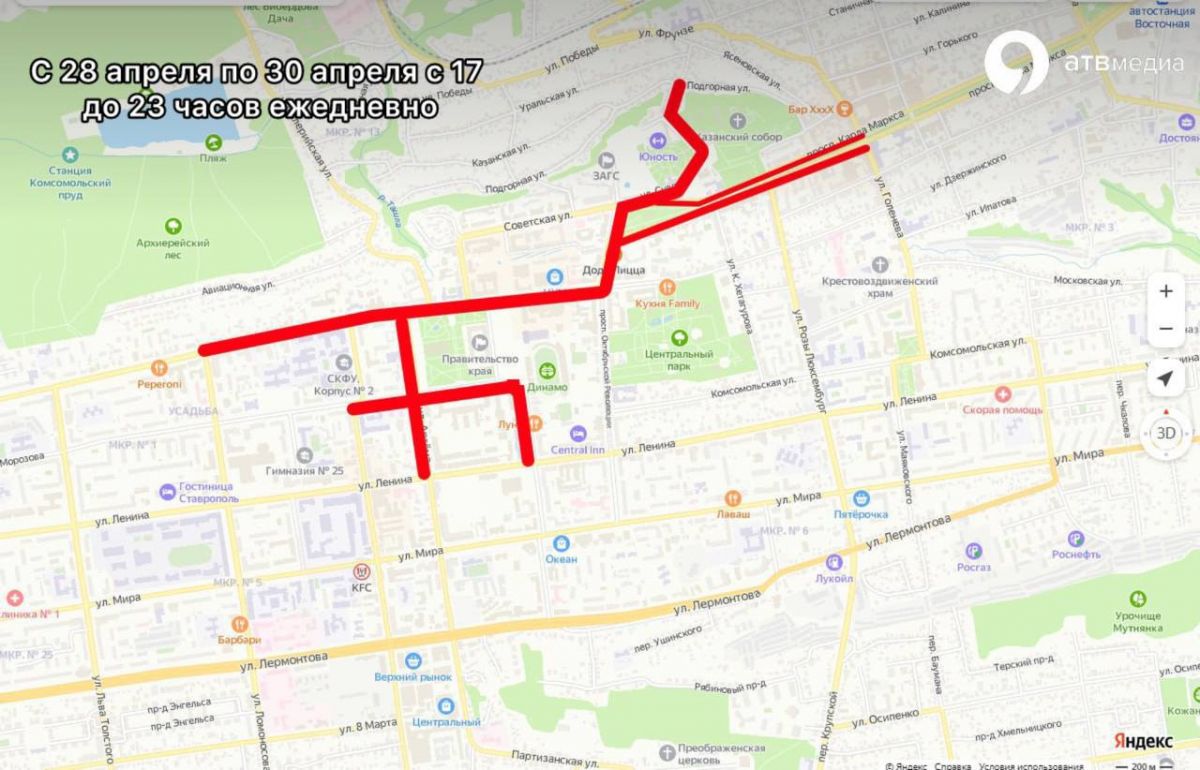 «Мы рады, что наш цветущий город принимает молодых талантливых и активных ребят со всей страны. Для обеспечения безопасности участников фестиваля и жителей города с 28 по 30 апреля ежедневно с 17 до 23 часов движение по некоторым улицам центра Ставрополя будет ограничено», – рассказал глава города Иван Ульянченко.