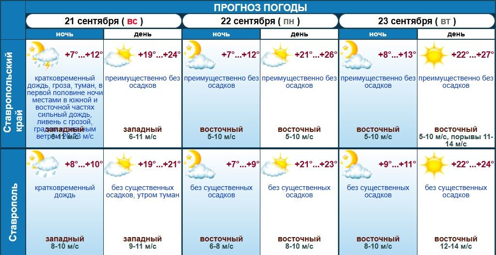 В Ставропольском крае на предстоящей неделе ожидается заметное потепление. По данным краевого гидрометцентра, в понедельник 22 сентября воздух прогреется до +21… +26 градусов, ночью – до +12, без осадков. Ветер всего 5-10 м/с.