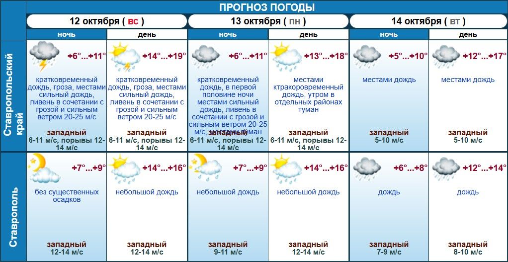 13 октября, в понедельник, ночью в Ставропольском крае ожидают сильные дожди и даже ливни с грозой. Порывы ветра будут достигать 20-25 м/с, температура воздуха опустится до +6 градусов. А днем термометры покажут от +13 до +18 градусов. На край опустится туман, местами пройдет кратковременный дождь.