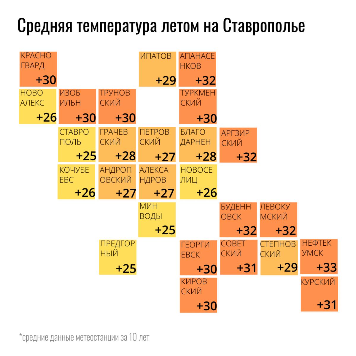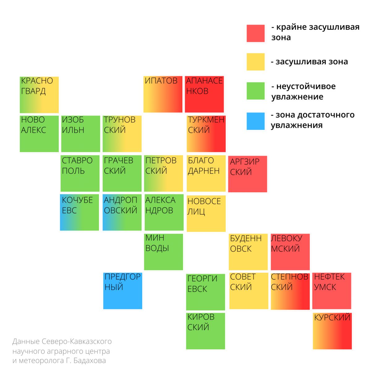 Засуху наглядно видно, если составить карту Ставрополья по температуре и осадкам в разных районах: