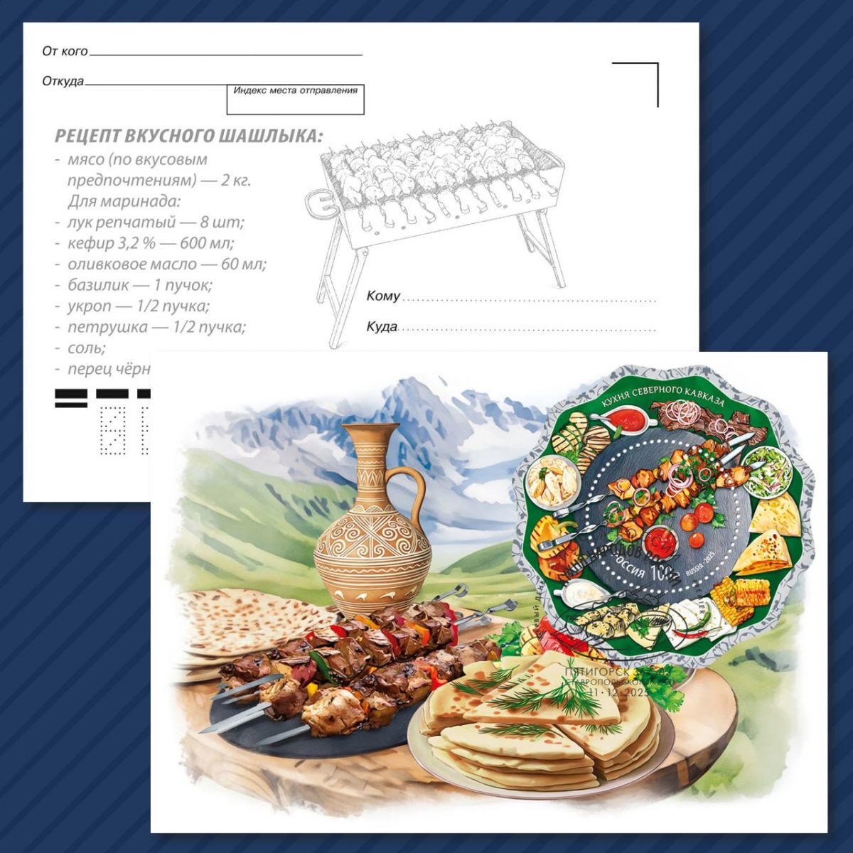Второй блок – «Кухня народов Кавказа». На круглой марке – шашлык на шампурах с овощами и соусом. На полях блока представлены осетинские пироги, хинкал, чуду, хычины, жижиг-галнаш, сыр и другие блюда народов Северного Кавказа.