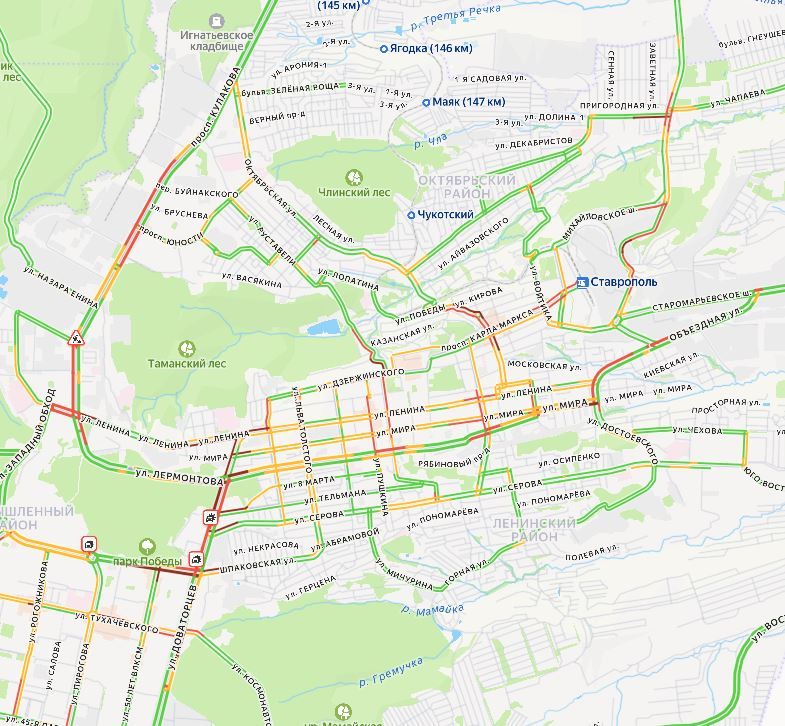 Вечером 29 января на дорогах Ставрополя образовались восьмибалльные пробки. Яндекс Карты показывают такую обстановку на момент 18 часов.