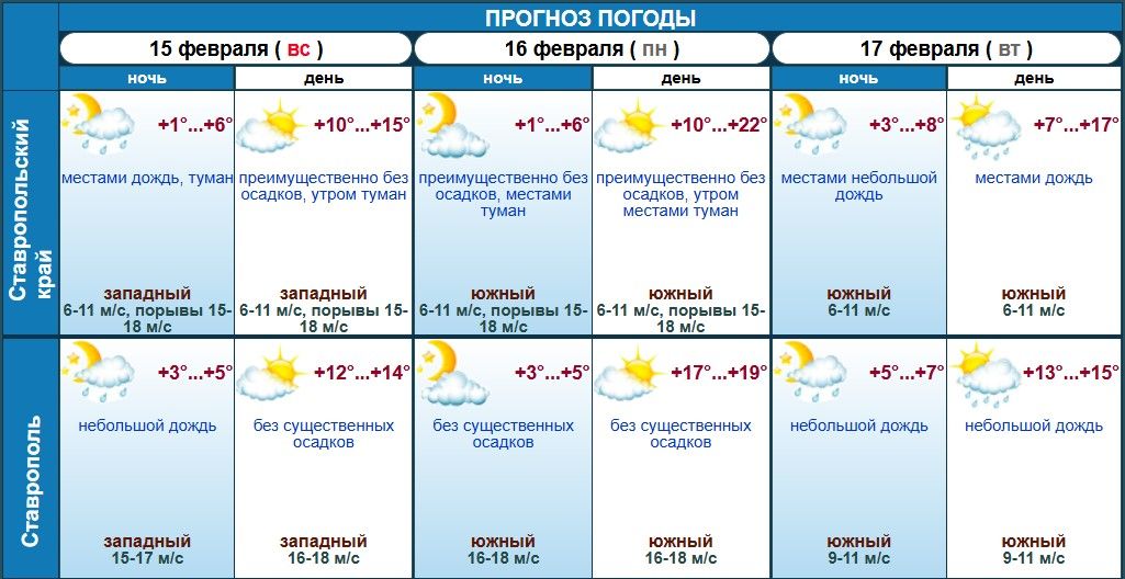 17 февраля, во вторник, на Ставрополье ночью и днем ожидают небольшой дождь, но температура опустится не сильно и сохранится в диапазоне +7 – +17 градусов.