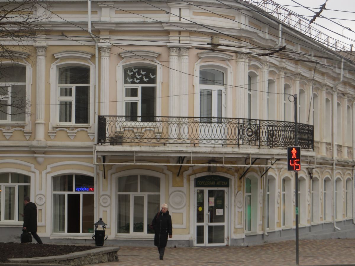 Второй аптеке на углу Дзержинского и Октябрьской Революции уже больше 150 лет. Между окнами и под ними есть тройные солярусы.
