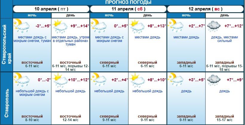 По информации Гидрометцентра Ставрополья, 11 апреля температура воздуха в регионе составит от 0 градусов ночью до +13 градусов днем. 12 апреля она повысятся до +2 градусов ночью, но понизится до +12 градусов днем.